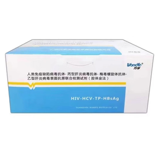 梅毒螺旋体抗体、人类免疫缺陷病毒抗体、乙型肝炎病毒表面抗原、丙型肝炎病毒抗体,四项联合检测试剂盒(胶体金法)